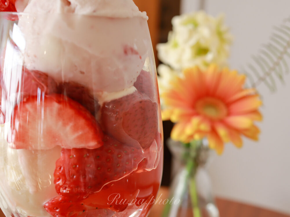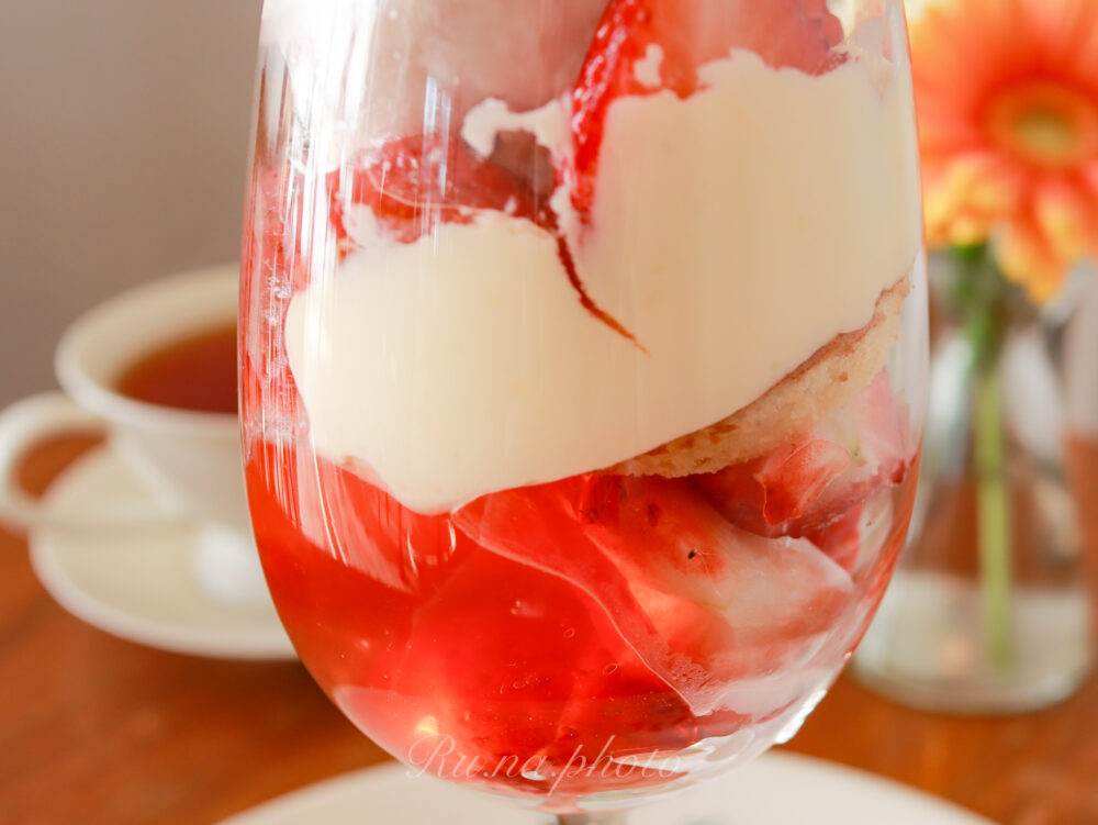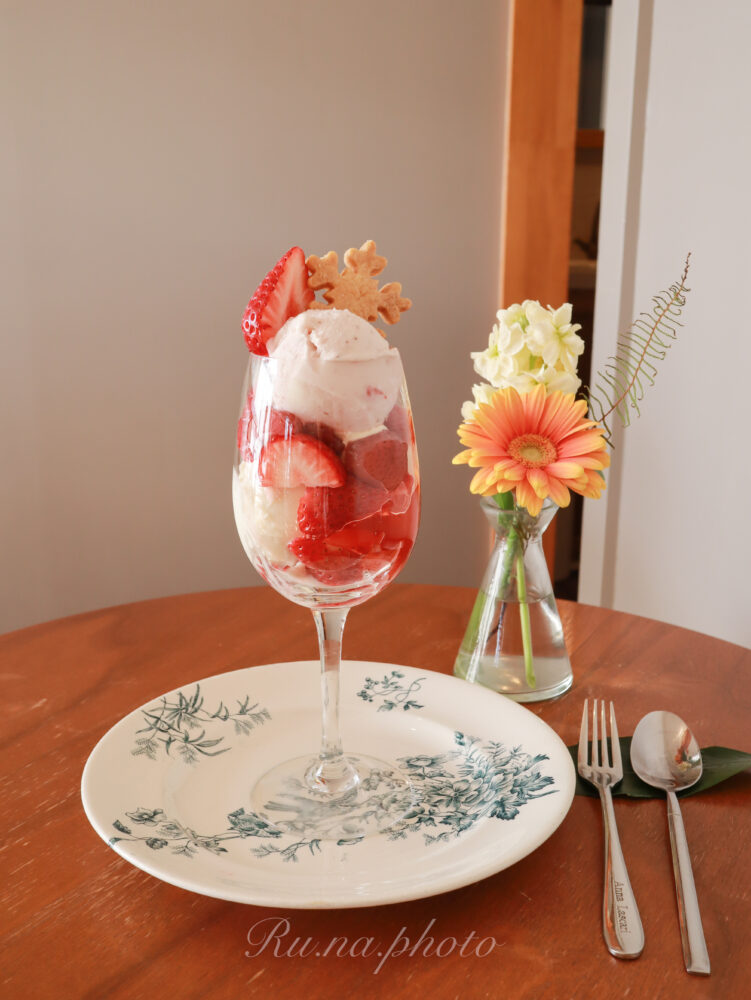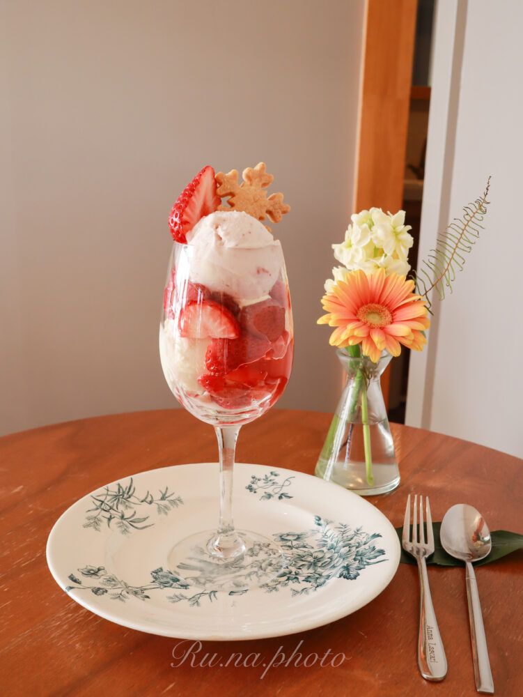 苺スイーツのパーツとフレッシュ苺とが、美しく美味しく組み立てられたパルフェ。